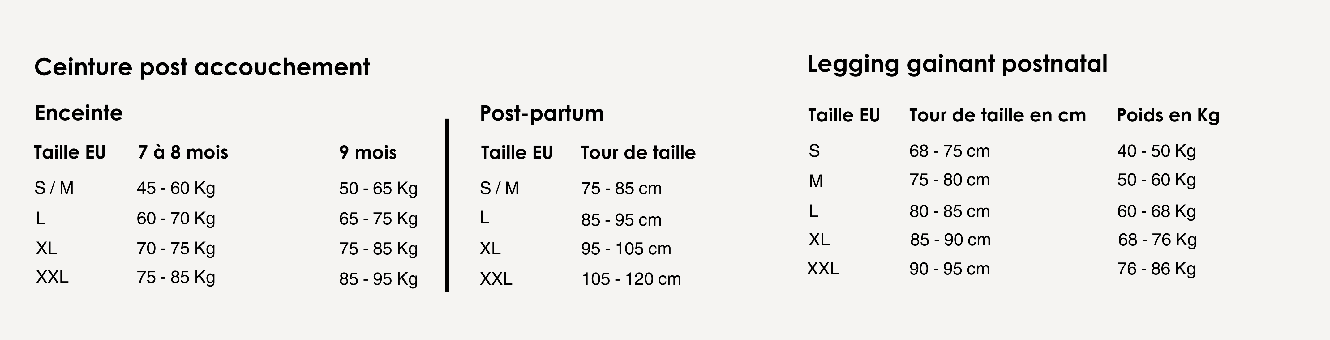 Si vous hésitez entre deux tailles, prenez une taille au-dessus car vous pourrez toujours serrer la ceinture au fur et à mesure de votre récupération !