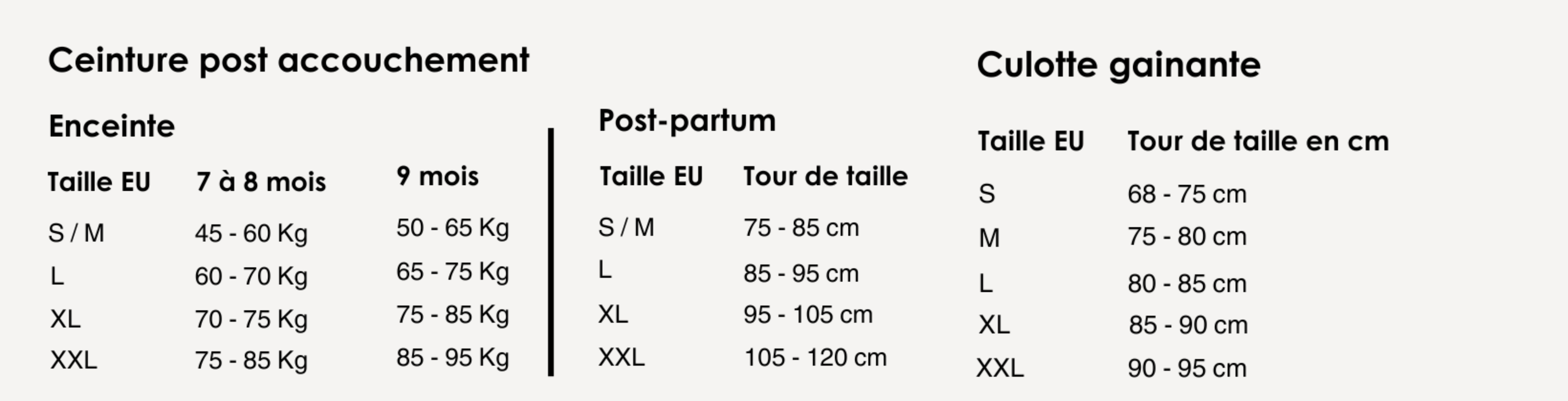 Veuillez sélectionner votre taille en fonction de votre poids (Kg) si vous êtes enceinte ou bien de votre taille après grossesse si vous avez accouché.